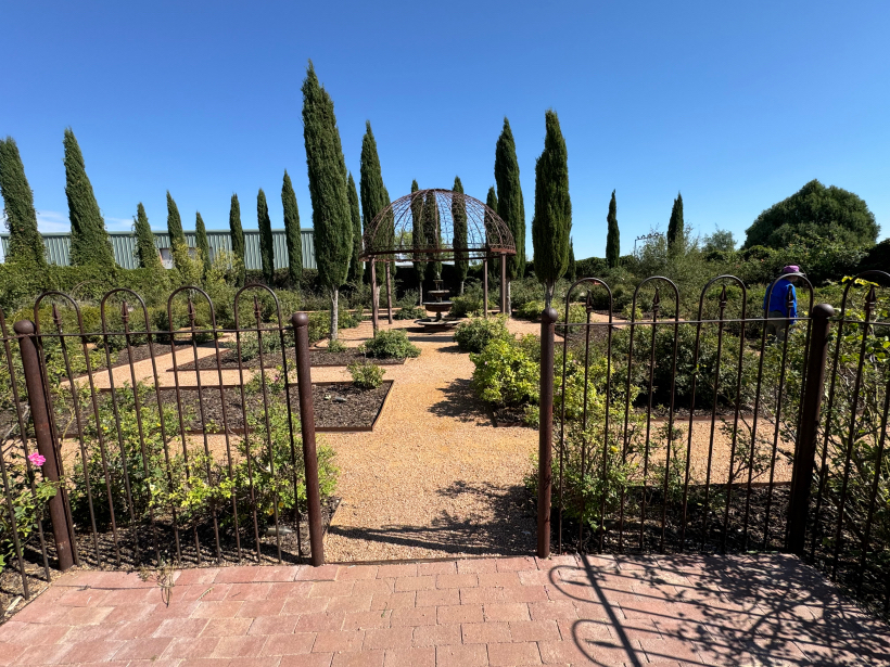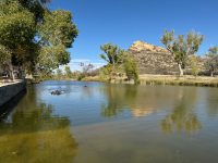 After lunch, we drove around town using the Alpine Driving Tour guide. We ended up at the Sol Ross State University campus where we saw several herds of deer gathered on the grounds. They seemed right at home, with many small fawns. We picked up a light dinner from Subway and took it back to the hotel. [Monday] This morning after breakfast at McDonald's, we drove to Marathon. We had reservations at the Gage Hotel. After a short while waiting in the lobby, our room was ready early and we were able to take our bags upstairs. We ate lunch in the V6 Coffee Shop next door. There is not a variety of dining options in Marathon, so the V6 Coffee Shop for breakfast and lunch is it. For dinner, the 12 Gage Bar & Restaurant is it for the town. They have good food, but it is not cheap. After lunch, we drove the short distance to Gage Gardens. It is a beautiful oasis in the arid desert landscape. There were lots of birds and butterflies. Monarch butterflies were abundant in the trees. They were at a short stop on their journey to Mexico for the winter. We then drove down south to Fort Pena Colorado Park. It is the site of a military base in the 1860's. A stream is dammed to form a nice lake. There was a group of ducks that thought that we should feed them something. A colorful mountain was nearby.