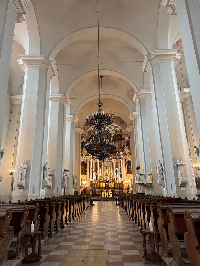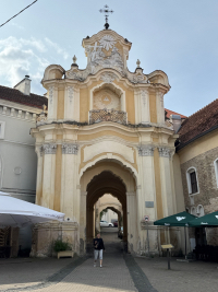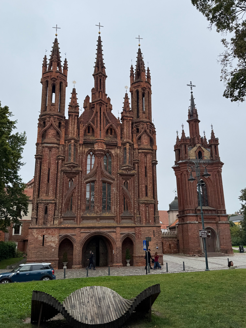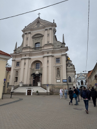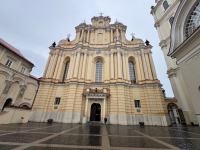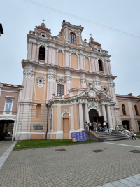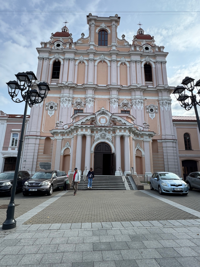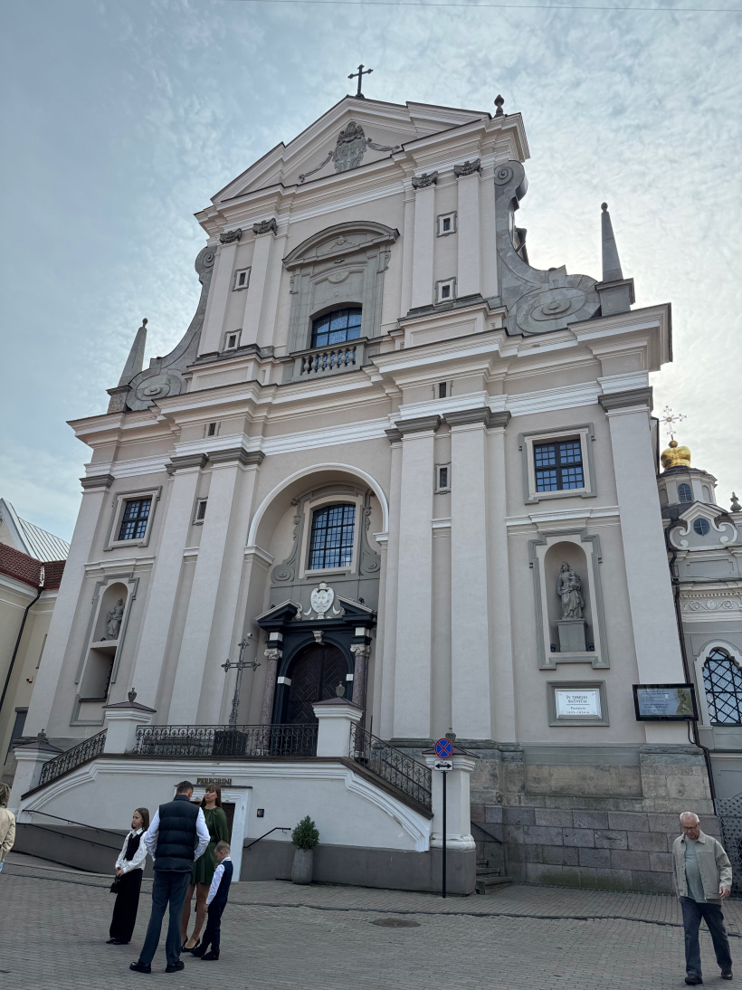 Watching an English language Polish TV channel at night, the big news was the Russian drones that encroached in Poland airspace Tuesday night. Those type of incursions into the Baltics by Russian aircraft or drones continued to be big news while we were there. It did not affect our visit. [Friday] Their late Summer weather was 56 degrees and rainy this morning. We ate breakfast in the hotel. We had scheduled a walking tour this morning but asked for a delay and they rescheduled it for 5:30 pm. This morning we walked to St. John the Baptist and St. John the Apostle and Evangelist Church which is on the Vilnius University campus and went inside the Jesuit Catholic Cathedral. Originally built in the 14th century, it was reconstructed in the 18th century and is known for its stunning architecture, which features intricate decorations and a beautiful interior.