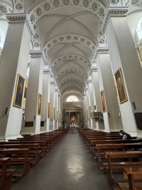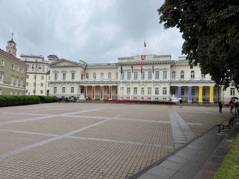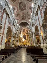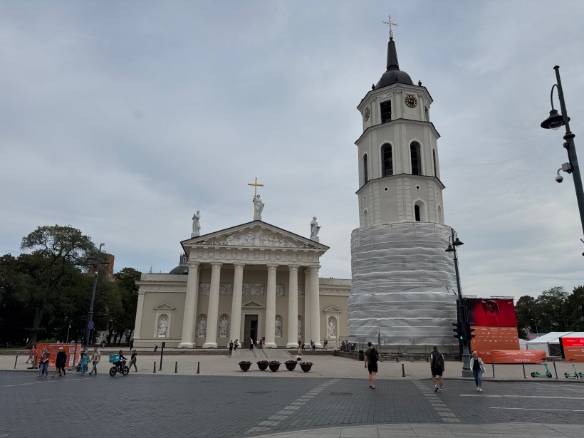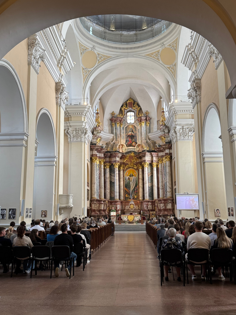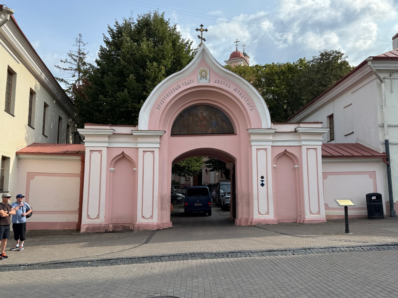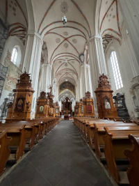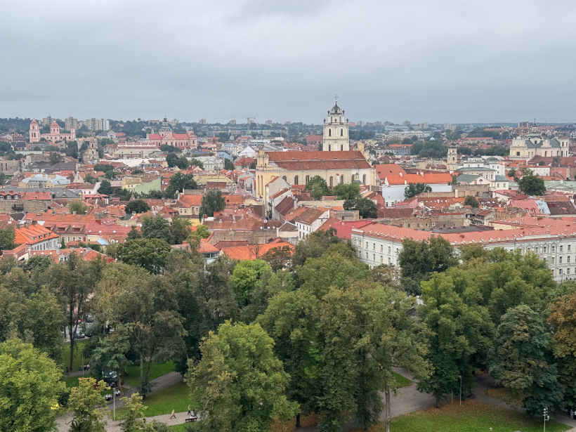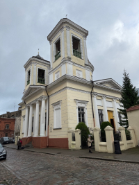 Watching an English language Polish TV channel at night, the big news was the Russian drones that encroached in Poland airspace Tuesday night. Those type of incursions into the Baltics by Russian aircraft or drones continued to be big news while we were there. It did not affect our visit. [Friday] Their late Summer weather was 56 degrees and rainy this morning. We ate breakfast in the hotel. We had scheduled a walking tour this morning but asked for a delay and they rescheduled it for 5:30 pm. This morning we walked to St. John the Baptist and St. John the Apostle and Evangelist Church which is on the Vilnius University campus and went inside the Jesuit Catholic Cathedral. Originally built in the 14th century, it was reconstructed in the 18th century and is known for its stunning architecture, which features intricate decorations and a beautiful interior.