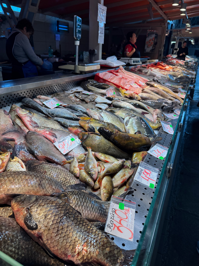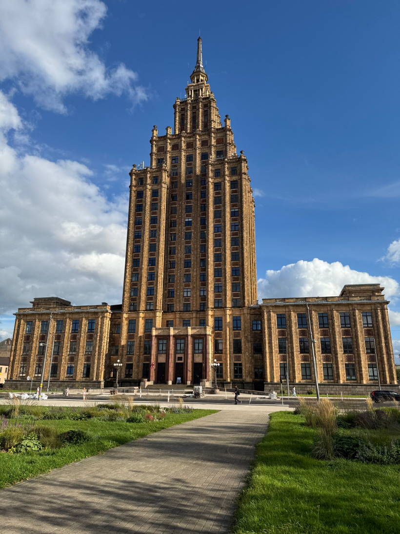 Next, we took Bolt to Riga Central Market. It is a large indoor and outdoor market with lots of fresh fish, fruit and vegetables. We ate lunch at a restaurant that had Uzbek food. We had Uzbek Mastava soup. We then walked past the Latvian Academy of Sciences, a 1961 Stalinist style building. We just looked at it from the outside.