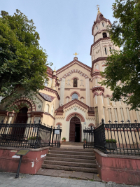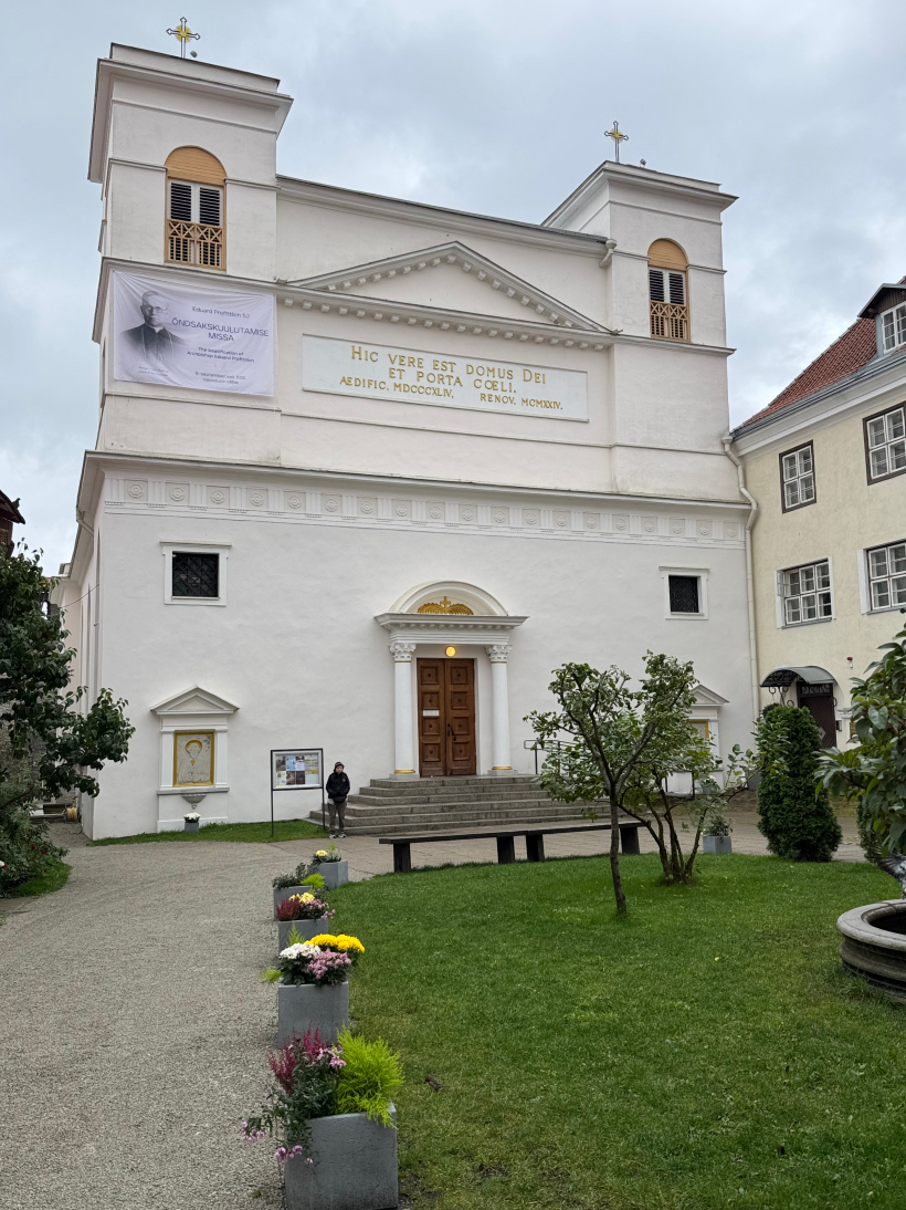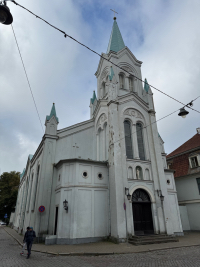 We took a Bolt (like Uber) back to the hotel. We then walked to the Galerija Centrs shopping mall nearby and ate dinner at a restaurant there. [Thursday] The weather was in the mid 50's this morning and overcast, but no rain. This morning we walked to Our Lady of Sorrows Catholic Church and visited. It was built in 1785.