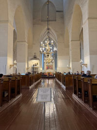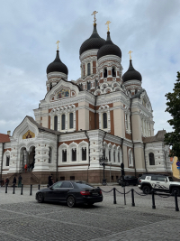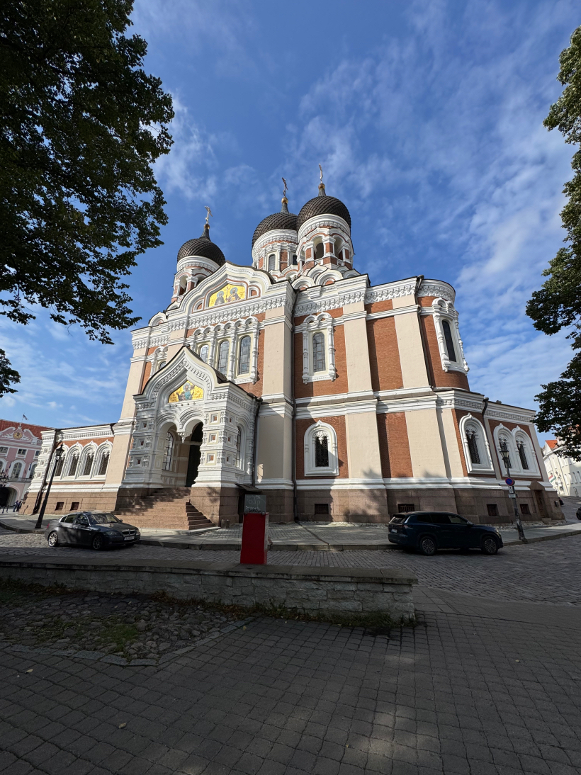 On the news today: Friday, three Russian fighter jets violated Estonian airspace and NATO jets were scrambled to escort them out of the airspace to Kaliningrad. [Sunday] This morning we attended the 10:00 am St. Olaf's Church service. It is a Baptist church. Everything was in Estonian language, the only word we understood was Amen. The music was some organ and a very good guitarist that played songs that you would hear played in an American church. He may have been a guest, because there was applause when he finished. The attendance looked small, but was probably several hundred. The church is very large. It was definitely Baptist - they took up a collection. The preacher used Charlie Kirk several times in his sermon. The sermon lasted over an hour and a half on hard wooden benches. A more contemporary service began at noon. It is believed to have been built in the 12th century and to have been the centre for old Tallinn's Scandinavian community before the Kingdom of Denmark conquered Tallinn in 1219. Its dedication relates to King Olaf II of Norway. After a little while in the hotel restaurant, we walked to a lot of places I had marked on Google maps. We went past Toompea Castle again, and into Alexander Nevsky Cathedral and went inside. The cathedral is an Eastern Orthodox cathedral that was built in 1894-1900, when the country was a part of the former Russian Empire.