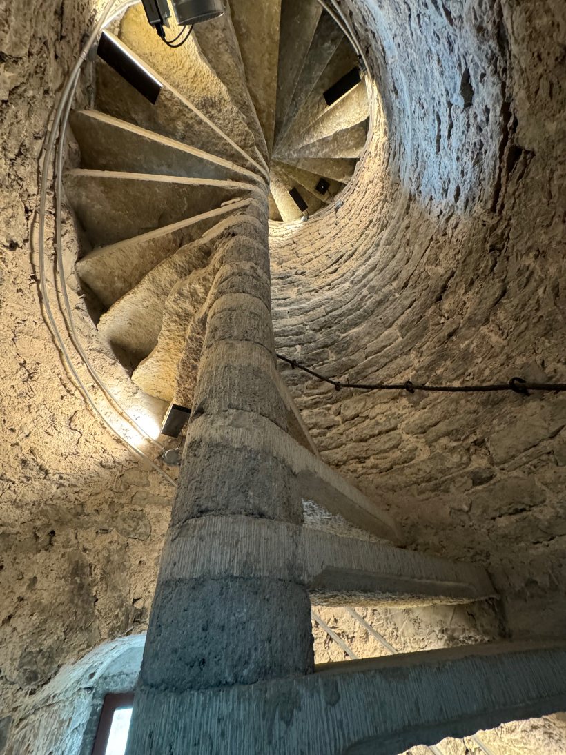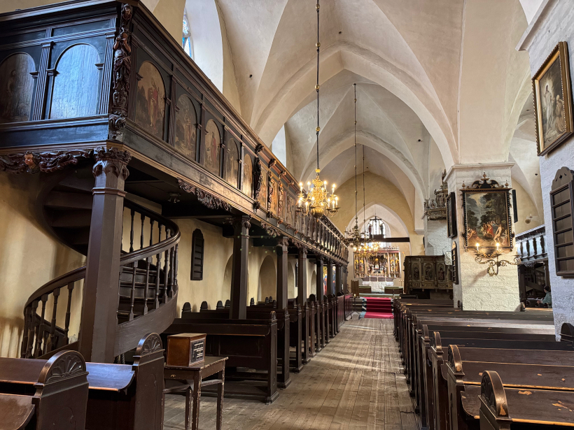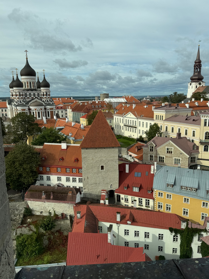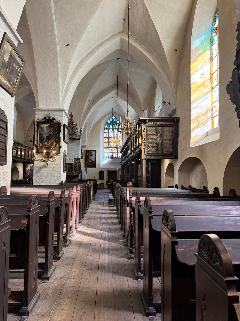 We went to St. Mary's Cathedral and inside. The church was originally established in the 13th century as the Roman Catholic cathedral, after Tallinn and northern Estonia had been conquered by the Kingdom of Denmark during the Northern Crusades. In the aftermath of the Protestant Reformation, the church became Lutheran in 1561 and is now seat of the Archbishop of Tallinn, the spiritual leader, and chairman of the governing synod, of the Estonian Evangelical Lutheran Church. We went to the Patkuli Viewing Platform for another great view of the city. We walked down the steep stairs down the side of the hill. We ended up at the Balti Jaama Turg, a train station with a market next door. We ate a snack there and brought some fruit. We walked around in some of the older wooden buildings in the area and took Bolt back to the hotel. The weather today was sunny and nice all day. It was probably the best day we had in the Baltics. [Monday] The weather was not as nice as yesterday. There was some rain bands, but it stopped by the time we finished breakfast. But the wind started blowing and the day was unpleasant, even though there was some sunshine. We walked to St. Nicholas Church and Museum. It is mostly a museum, although they have Orthodox services. It was strange to us that it has pews. We took the elevator to the top of the tower to look out over the city. It has a great view of the city. We thought we would take the winding stairs from the 4th to the 3rd level, but we had to go all the way to the 2nd, which turned out to be a lot of steps!