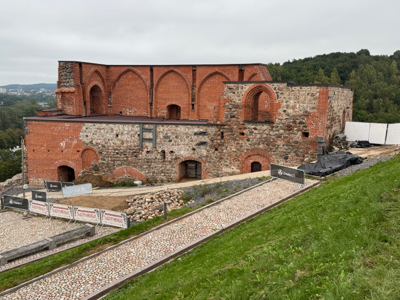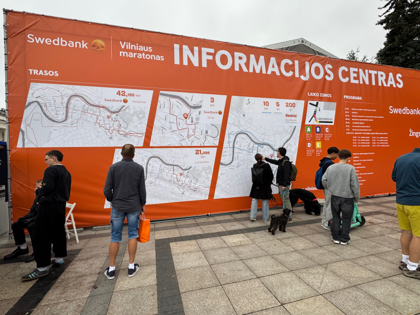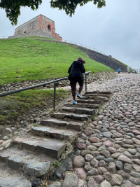 After the tour we walked back to the hotel. We rested for a little over an hour and went to the Caffeine shop had coffee. Later in the afternoon, we walked up a large hill to Gediminas Castle overlooking the city. It gave a good view of the old town and new town across the river. We came back to the hotel and ate dinner in the hotel restaurant. [Sunday] Today the weather was nice and we saw the sun for the first time in Lithuania. It was also the day for the Vilnius Marathon, which began and finished right in the street beside our hotel. The first race began at 8:30 am. Different races were conducted throughout the day until everything ended at 6:00 pm. The staging area was across the street in Vilnius Cathedral Square. We ate breakfast in the hotel, watching the start of the race out the restaurant window.