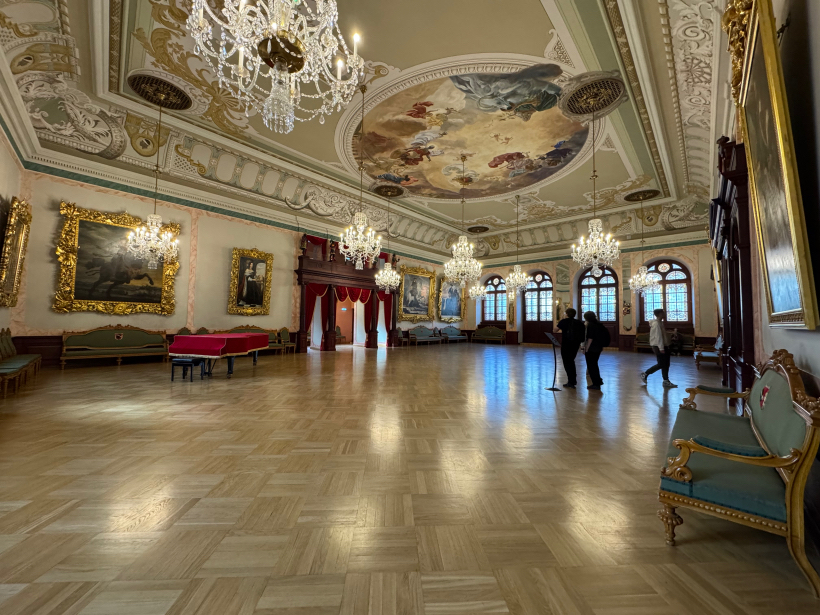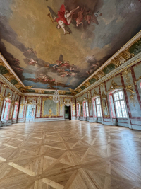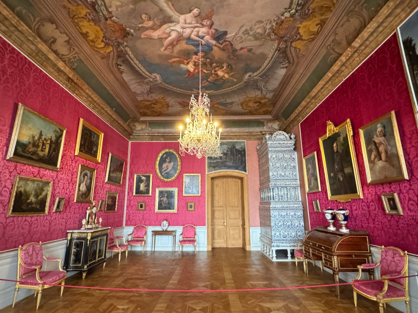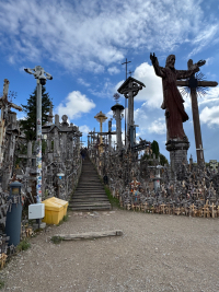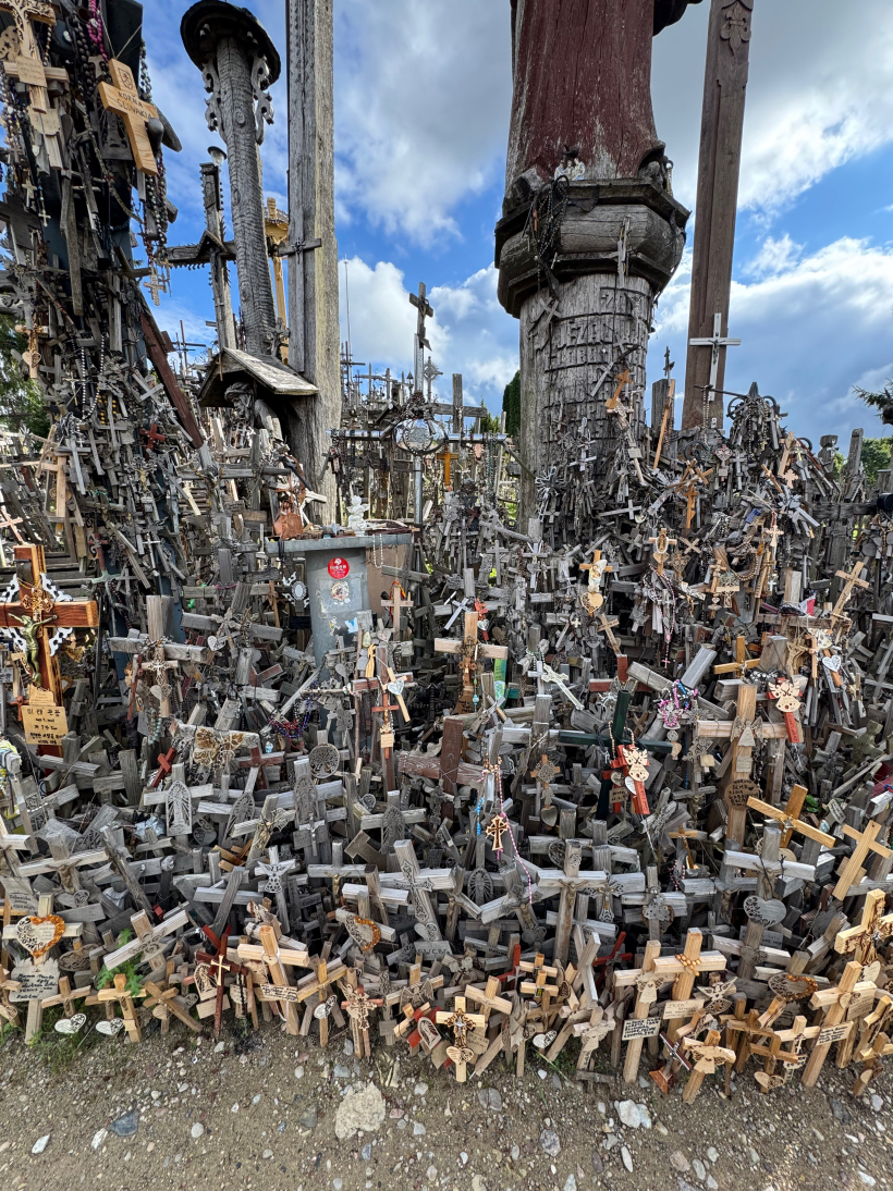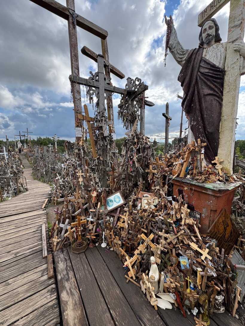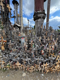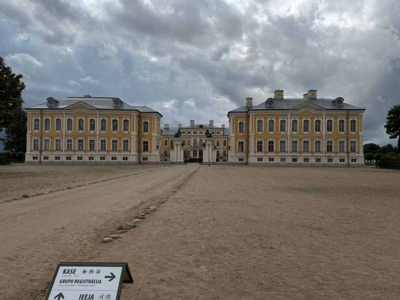 As we got back to the hotel at 2:30 pm, we watched the beginning of the 5K Marathon. Many more races began later in the day. [Monday] After breakfast, we had booked a transfer by private car to Riga, Latvia, which included sightseeing stops. The weather was misty and foggy and about 58 degrees. It was not good for sightseeing. We left at 9:00 am and got to our first stop at the Hill of Crosses at about 11:30 am. The weather had improved and we didn't need an umbrella. The Hill of Crosses began in 1831 during the Tsarist Russian rule. When the Soviets occupied Lithuania, they tried to destroy the crosses, but they kept reappearing. There are now several hundred thousand from all over the world. The next stop on our trip to Riga was Rundale Palace, after we crossed the border from Lithuania to Latvia. We arrived at 12:30 pm and the rain was absent. The palace was begun in 1736. The structure suffered damage during the 20th century and the rooms have served as an elementary school and a granary. Restoration began in 1972 and is still in progress.
