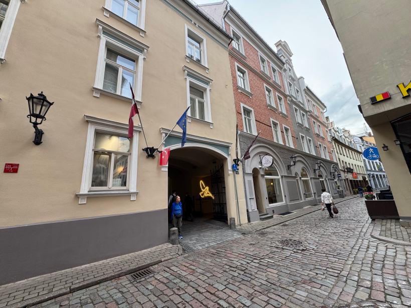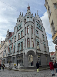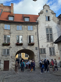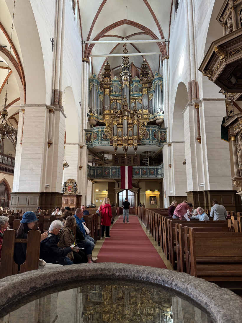 Afterwards we walked back toward the hotel and stopped for dinner at the Kwak Inn Restaurant across the street from the hotel. Before bedtime, we went downstairs to the coffee shop and had decaf coffee and a treat. [Wednesday] This morning was another nice sunny day. We got a late start and finished breakfast at almost 10:00 am. We walked back to the area of the Cat House. The "story" of the black cats in Riga revolves around the Cat House, where two black cat sculptures were placed on the roof in revenge by a wealthy tradesman who had been denied membership in the Great Guild or a dispute with the Riga Town Council. The sculptures' tails initially faced the offending institution, but a court order eventually led to them being turned around after the tradesman's acceptance into the Guild. The cat house is now a famous Riga landmark, symbolizing the spirit of independence. Next, we walk to the Swedish gate. The Swedish Gate is the only surviving city gate from the city's medieval fortifications and was built in 1698 during Swedish rule to provide access to outside barracks. The gate is a part of the surviving city walls, and the setting for local legends, most notably the tale of a woman who was bricked into the wall for a forbidden love with a Swedish soldier. We then walked to Riga Cathedral where we attended an organ concert by Aida Zingite. Music was by Bach and Liszt. Riga Cathedral organ is considered to be one of the world's most valuable historic organs. It was built in 1883- 1884 by a famous German organ building company. After the concert we went back to the hotel. When we were ready to leave the hotel again, it was raining. It stopped and we walked to the House of Blackheads and toured. It is one of Riga's most impressive reconstruction projects. The original building was erected in 1334 as a warehouse, meeting and celebration place for merchants.