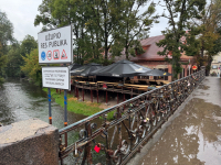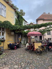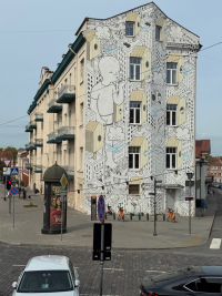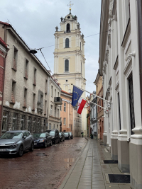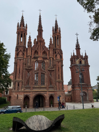 We then walked to St. Anne's Church and went inside the Benedictine Catholic Cathedral. It was built in 1495–1500. It is a prominent example of both Flamboyant and Brick Gothic styles. In 1812, Napoleon's soldiers used it as a barracks on their way to attack Moscow. On the way back to the hotel, we stopped for coffee and a cookie at the Caffeine Cafe. The drizzling rain continued. At 5:30 we met our guide and even though the weather was still misty, we went to Vilnius University and saw many of the buildings. We then went into the Republic of Uzupia, which is "an independent country" within Lithuania. It was formed by artists and you are required to smile when you are in the country. It is surrounded on three sides by the Vilnia River. They have their own laws and currency. After two informative and somewhat damp hours, we ended the tour.