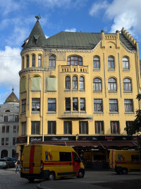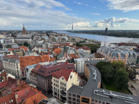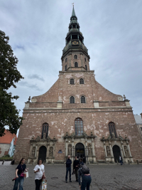 [Tuesday] It rained during the night, but stopped by the time we finished eating breakfast in the hotel. At 10:30 am we went on our Old Town Riga walking tour. Some of the sights we saw were Riga Town Hall Square, St. Peter's Church, St. John's Church, Livu Square, The Cat's House, and Riga Cathedral. We finished the tour at 12:30 pm and went back to the hotel. After a short stay in the hotel, we walked back to St. Peter's Church. It is a Protestant church. It was bombed in 1941, and is still being restored. We went inside, and also up the tower for a view of the city. It was very windy and cold up there, but the view was beautiful.